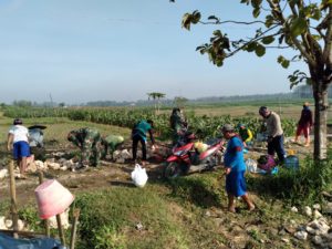 Bersama anggota Kodim 0721/Blora yang lain, tampak Babinsa menyemangati para warga desa Geneng untuk menyelesaikan target pekerjaan di beberapa lokasi proyek TMMD.