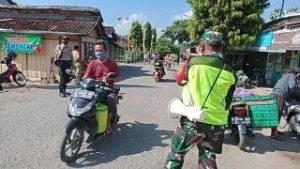 BLORA – Anggota Koramil 03 Banjarejo Kodim 0721/Blora, dipimpin Pelda Nyoto bersama empat orang anggota, Polsek Serta Satpol PP Kecamatan Banjarejo pada masa Pemberlakuan PPKM Darurat Mikro tak kenal lelah melaksanakan pengawasan dan himbauan perbup no 55 tentang penegakan prokes Covid 19 di wilayah Kecamatan Banjarejo Kabupaten Blora. Jumat (16/7/21)
