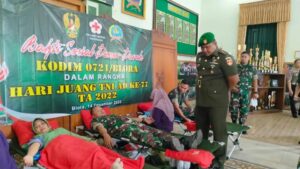 BLORA – Memperingati Hari Juang TNI AD Ke-77 TA. 2022, Komando Distrik Militer (Kodim) 0721/Blora bersama Palang Merah Indonesia (PMI), melaksanakan donor darah.