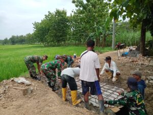 Blora,- Begitu cuaca cerah, TNI anggota Koramil 12/Ngawen dan warga langsung main keroyok pembangunan Plat Beton di Desa Bradag, Kecamatan Ngawen, Kabupaten Blora, yang merupakan sasaran fisik karya bakti mandiri semester I Kodim 0721/Blora.