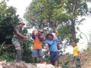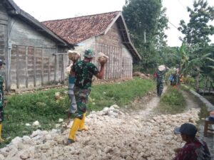 Seperti halnya yang dilakukan Serda Hariyanto ikut yang tergabung dalam Karya Bakti Mandiri (KBM) bersama masyarakat Desa Jatiklampok, bahu membahu melangsir batu yang digunakan untuk pembangunan jalan, talud dan plat beton.