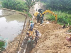 Sejumlah personil anggota TNI dari Koramil 03/Banjarejo bersama warga setempat tampak guyub bekerja sama bahu membahu membuat talud, Jumat (17/03/2023).