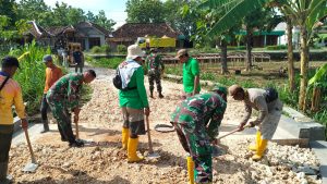 Dengan cangkul dan sekop di tangan, para prajurit dan warga bekerja berdampingan tanpa mengenal lelah. Mereka bersama-sama merapikan setiap jengkal tanah demi memperlancar pembangunan jalan yang akan meningkatkan konektivitas antar wilayah.