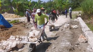 Setiap hari, anggota Satgas bersama warga secara bergantian melansir material batu menggunakan arco menuju lokasi pembangunan talud. Setibanya di lokasi, material langsung digunakan untuk membuat pondasi secara gotong royong antara TNI dan masyarakat.
