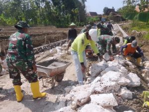 BLORA – Prajurit Satgas TNI Manunggal Membangun Desa (TMMD) Sengkuyung Tahap IV Tahun Anggaran 2025 Kodim 0721/Blora bersama warga Desa Muraharjo, Kecamatan Kunduran, Kabupaten Blora, terus mempercepat proses pembangunan talud sepanjang 178 meter di kanan kiri jalan, Kamis (09/10/2025).