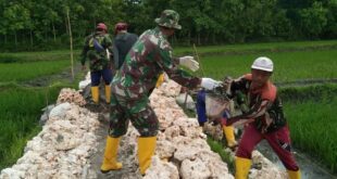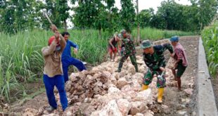 BLORA – Gotong-royong anggota Koramil 04/Tunjungan dengan warga di lokasi Karya Bakti Mandiri (KBM) dukuh Nganguk Desa Gempolrejo terlihat sangat nyata kemanunggalan TNI dengan rakyat. Saling bahu membahu bergelut dengan batu untuk mempercepat proses pembuatan jalan makadam dan talud. Seperti pepatah mengatakan ibarat ikan dan air yang tak terpisahkan, berbaur …